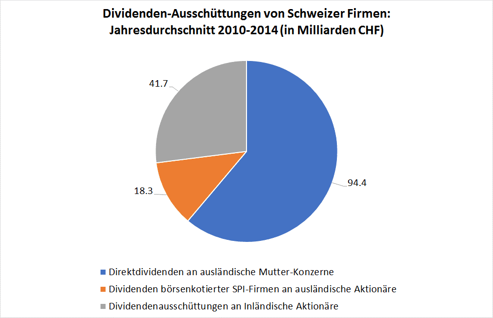 Aufschlussreich und für die Stimmbürger/-innen von Interesse ist auch, wer konkret von diesem Dividendensegen profitiert. Anlässlich der USR III wollte SP-Nationalrätin Jacqueline Badran es genau wissen und hat vom Bundesrat eine detaillierte Antwort erhalten (NR 16.1061 Dividendenausschüttungen in der Schweiz). Einschliesslich der steuerfreien Auszahlung von Kapitaleinlagereserven schütteten Schweizer Firmen im Mittel der Jahre 2010 – 2014 154.4 Milliarden CHF Dividenden pro Jahr aus. Davon entfielen 94.4 Milliarden auf Ausschüttungen im sogenannten Meldeverfahren, die von CH-Töchtern direkt an ihre ausländischen Mutter-Konzerne gingen. Von den Aktien der börsenkotierten SPI-Firmen sind gut 50 Prozent in der Hand ausländischer Anleger: Damit kommen nochmals 18.3 Milliarden CHF hinzu, die ins Ausland abfliessen.