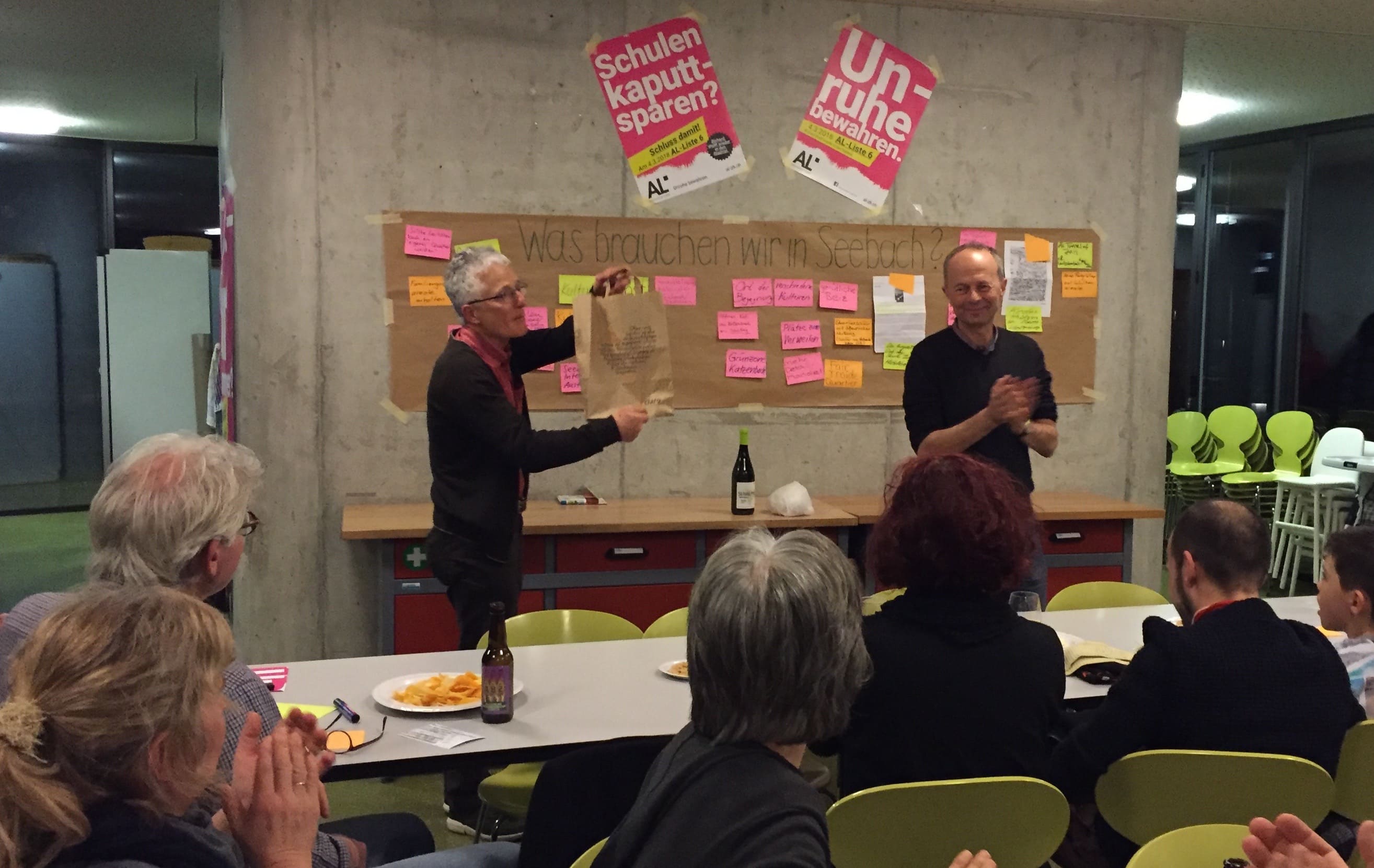 Ob im Kubaa in Affoltern oder im Gemeinschaftsraum Katzenbachweg in Seebach: Beim Betreten der Räume fiel mir an beiden Abenden zuerst je ein grosses Packpapier-Plakat auf. Es hatte nur einen Titel darauf: «Was brauchen wir in Affoltern?» bzw. «… in Seebach?» Der Rest war leer. Auf dem Tisch lagen grosse farbige Post-it, die von Gesprächsleiter, AL-Fraktionspräsident und ZH-Nord-Bewohner Andreas Kirstein an die Besucher*innen verteilt wurden. Mit der Bitte, dass sie ihre Wünsche für ihre Quartier-Umgebung notieren. Danach klebte Andreas die Zettel aufs leere Plakat.