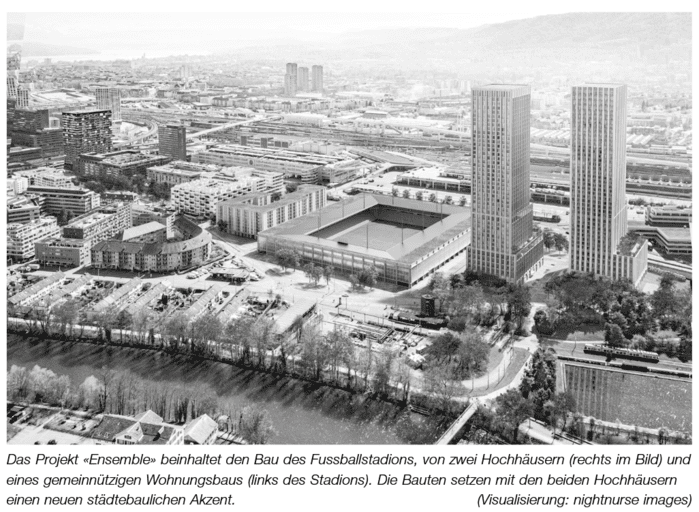 Auch im November 2018, als die beiden Immo-Hai-Türme der Credit Suisse mit rekordhohen 131 und 137 m im Sperrfeuer der Stadiongegner*innen standen, nahm der Stadtrat bei der Visualisierung in der Abstimmungszeitung nicht Zuflucht zu Vernütigungen und zeigte die beiden Hochhäuser in ihrer ganzen Wucht. Hier ist allerdings zurzeit kein Vorher-Nachher-Vergleich möglich, weil ungewiss ist, ob und wann das Projekt realisiert wird…