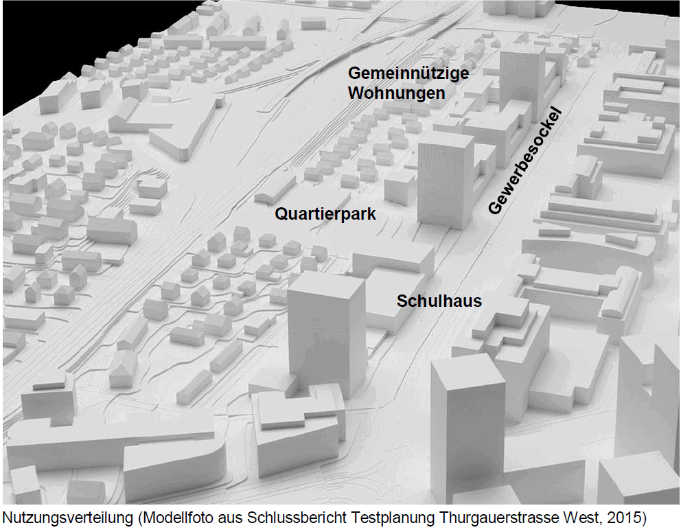 Auf der Projekt-Webseite Thurgauerstrasse bezeichnet das Hochbaudepartement die Zeichnung selber als «Stimmungsbild», in der Abstimmungszeitung wird sie als «Vision» charakterisiert. Mit sachlicher Information der Stimmbürger*innen hat das gar nichts zu tun: Das ist buchstäblich Schönfärberei und zeichnerisches Greenwashing. «So nöd!» meinen Christian Häberli, Präsident der IG Grubenacker, AL-Fraktionspräsident Andreas Kirstein und das Referendumskomitee gegen den Gestaltungsplan Thurgauerstrasse. Zusammen mit dem Verfasser haben sie am 12. Oktober beim Bezirksrat einen Stimmrechtsrekurs eingereicht. Unsere Forderung: Der schönfärberische Helgen muss aus der Abstimmungszeitung entfernt und durch eine sachgerechte Illustration ersetzt werden. Zum Beispiel durch das in das Stadtmodell eingefügte amtliche Modellbild der Testplanung, auf dem man die Proportionen der geplanten Neuüberbauung klar erkennen kann: