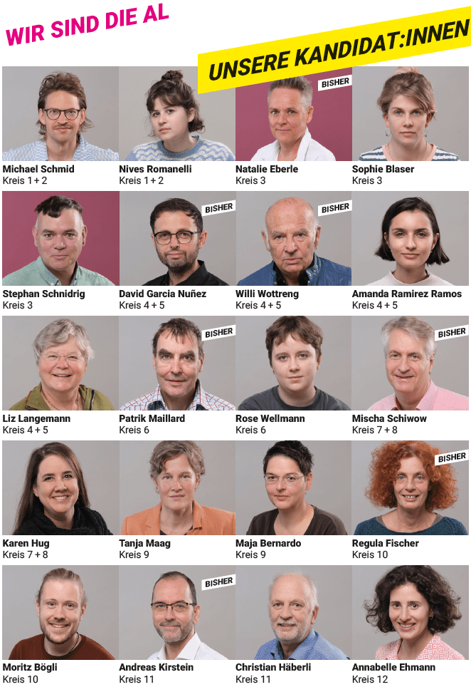 Die Palette an Berufen und Interessensgebieten unserer Kandidierenden ist divers: So haben wir neben den amtierenden Gemeinderät:innen und den altgedienten AL-Aktivist:innen junge Leute, die demnächst ihr Studium der Politik- oder Agrarwissenschaften abschliessen oder neben ihrer beruflichen Tätigkeit die Ausbildung an der SOZ beenden. Von der Schülerin am Liceo Artistico bis zum App-Designer, von der Labortechnkerin bis zur Data Engineerin und Ärztin oder auch von der Verantwortlichen eines Gesundheitslehrganges bis zum Meteorologen ist ein breites Spektrum an Berufen vertreten. Mehrere neu Kandidierende wurden in den letzten drei Jahren politisiert. Sie sind aktiv in der Klimabewegung, nehmen regelmässig an der Critical Mass teil oder sind durch den Frauenstreik 2019 politisch erwacht und haben 2021 den Streik organisatorisch unterstützt. Andere haben bereits Referenden organisiert (Thurgauerstrasse) oder betreiben eine Hofbar mit Kulturkonzerten. Auch die neuen AL-Kandidierenden sind bereits vielfältig vernetzt und bringen einiges an politischem und gemeinschaftlichem Engagement mit.