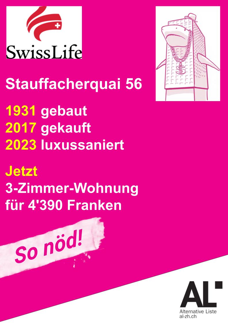 Im Zuge der neoliberalen Welle wurde die Rentenanstalt 1997 in eine börsenkotierte Aktiengesellschaft umgewandelt, die 600’000 Genossenschafter:innen erhielten Aktien zugeteilt. Allerdings erfolgte danach eine rasche Konzentration des Aktienbesitzes. Aktuell sind noch 166’814 Aktionär:innen eingetragen und 0.73% davon kontrollieren knapp zwei Drittel aller Aktien. Die grössten Aktenpakete halten der US-Investment-Manager BlackRock (5.3%) und die UBS-Fonds (3.09%). Heute gehört die Swiss Life zu den aggressivsten Playern in der Immobilienszene, sowohl was die Kauf- wie die Mietpolitik angeht. Schlagzeilen machte vor vier Jahren der Kauf eines SRF-Grundstücks in Seebach für 81 Mio Franken (12’700.- pro m2); die Stadt Zürich war bei 40 Mio Franken aus dem Bietverfahren ausgestiegen. Lange Zeit war die Swiss Life der unbestrittene Platzhirsch, mit der Fusion von UBS und CS musste sie diesen Spitzenplatz abgeben. Ihr Schweizer Immobilienbesitz hat einen Bilanzwert von 35.1 Milliarden Franken und umfasst 38’500 Wohnungen, davon allein rund 5’000 in der Stadt Zürich, und zahlreiche Geschäftsliegenschaften.