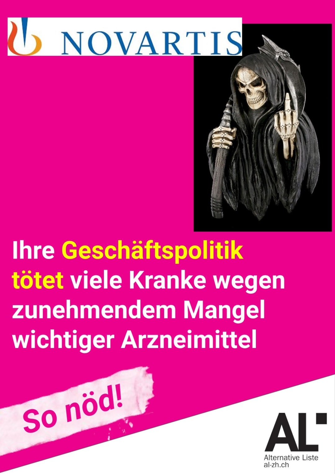 In einer solchen Situation müsste ein funktionierender Markt mit einer Spur sozialer Verantwortung sowohl in die Erforschung neuer Antibiotika wie auch in die Rückverlagerung der Pharmaproduktion in heimische, kontrollierbarere Gefilde investieren. Für diese Investitionen braucht es natürlich Geld. Fehlt es der Novartis etwa an finanziellen Mitteln? Ganz im Gegenteil! Von ihren Profitmargen können andere Industriesparten nur träumen, mehr Gewinn macht nur die illegale Drogenmafia. Der Konzern schwimmt im Geld und hat im Juli angekündigt, dass er bis Ende 2025 für 15 Milliarden Franken eigene Aktien zurückkaufen will, um den Wert der verbleibenden Aktien entsprechend zu steigern. Zum Vergleich: Pro Jahr investiert Novartis 10 Milliarden Franken in Forschung und Entwicklung. Das Motto ist klar: Geschenke an die Aktionär:innen statt Investitionen in eine sichere Medikamentenversorgung der Bevölkerung.