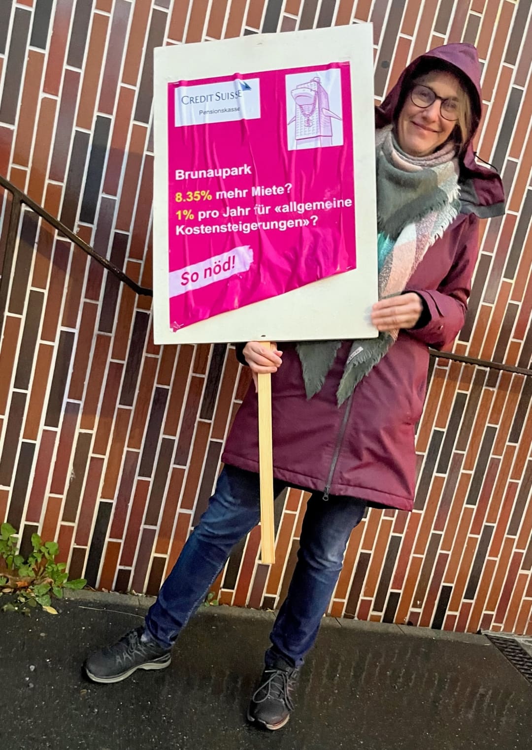 AL-Kantonsrätin Nicole Wyss gegen Mietzins-Abzocke der Ex-Credit-Suisse-Pensionskasse im Brunaupark.