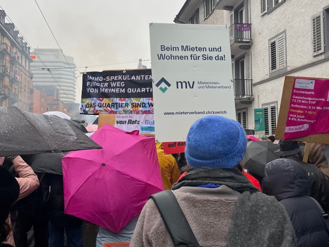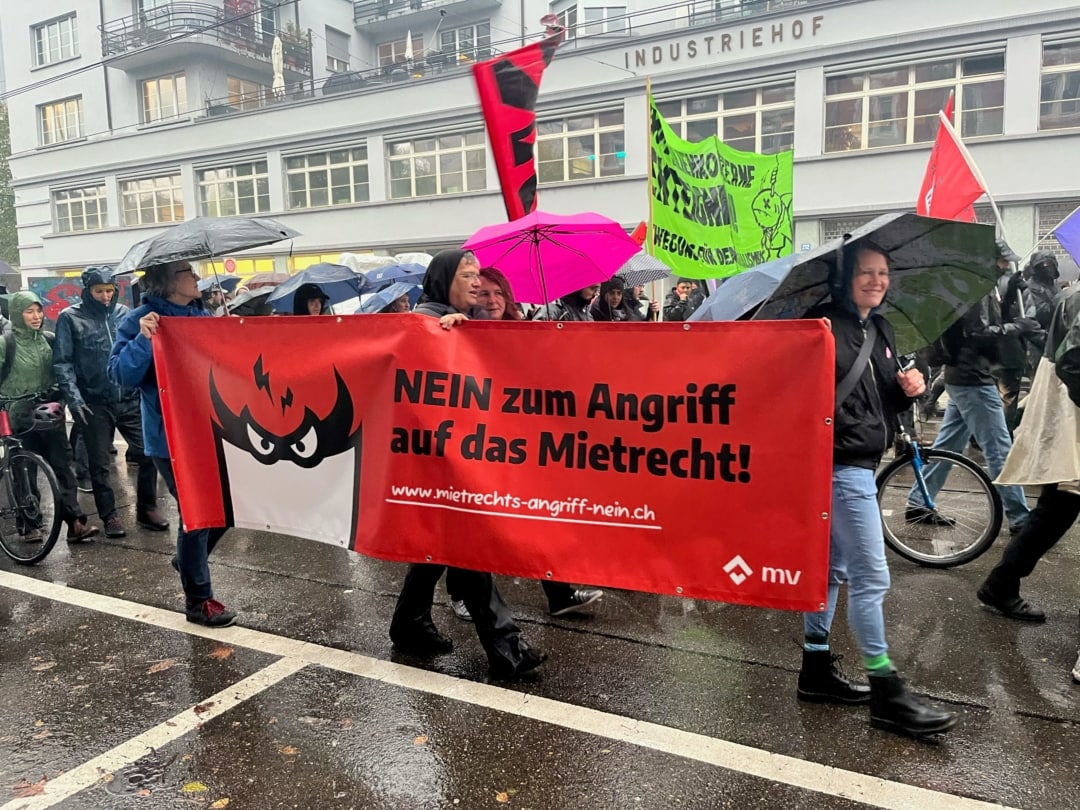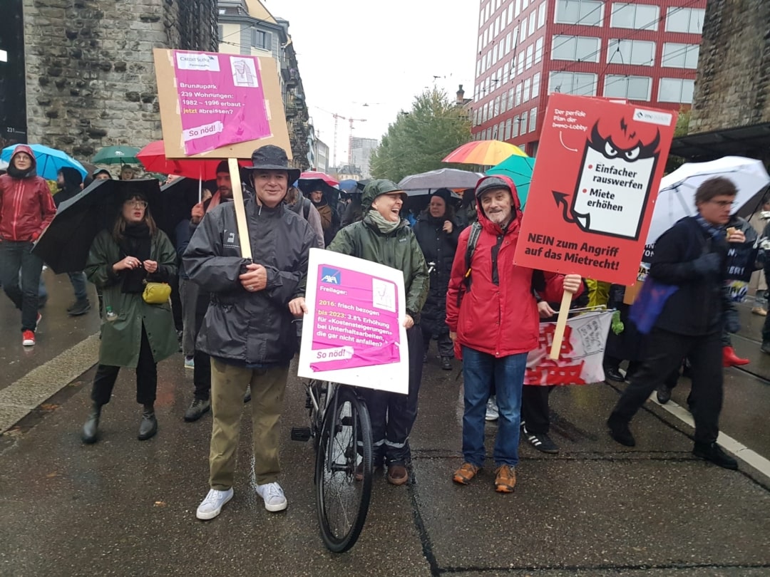 Trotz Regen gute Laune: Stephan Schnidrig und die Alt-Gemeinderät:innen Natalie Eberle und Niggi Scherr protestieren gegen Abriss im Brunaupark, Miet-Abzocke im Freilager und den Angriff der Immohaie auf das Mietrecht.