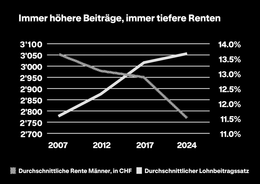 Diese BVG-Reform ist eine teure Mogelpackung – gerade für die Frauen. Die Renten aus den Pensionskassen sinken laufend. Heute liegt die Rente durchschnittlich 300 Franken tiefer pro Monat als vor 15 Jahren. Während die Lohnbeiträge im selben Zeitraum um 14 Prozent erhöht wurden. Gerade jene, die in den nächsten zehn Jahren in Rente gehen, müssen sich auf noch niedrigere Renten einstellen. Denn für dasselbe Ersparte gibt es immer weniger Rente.