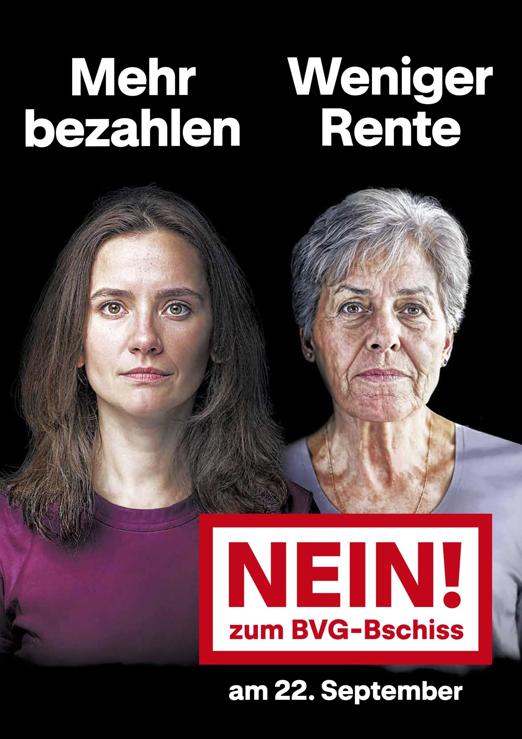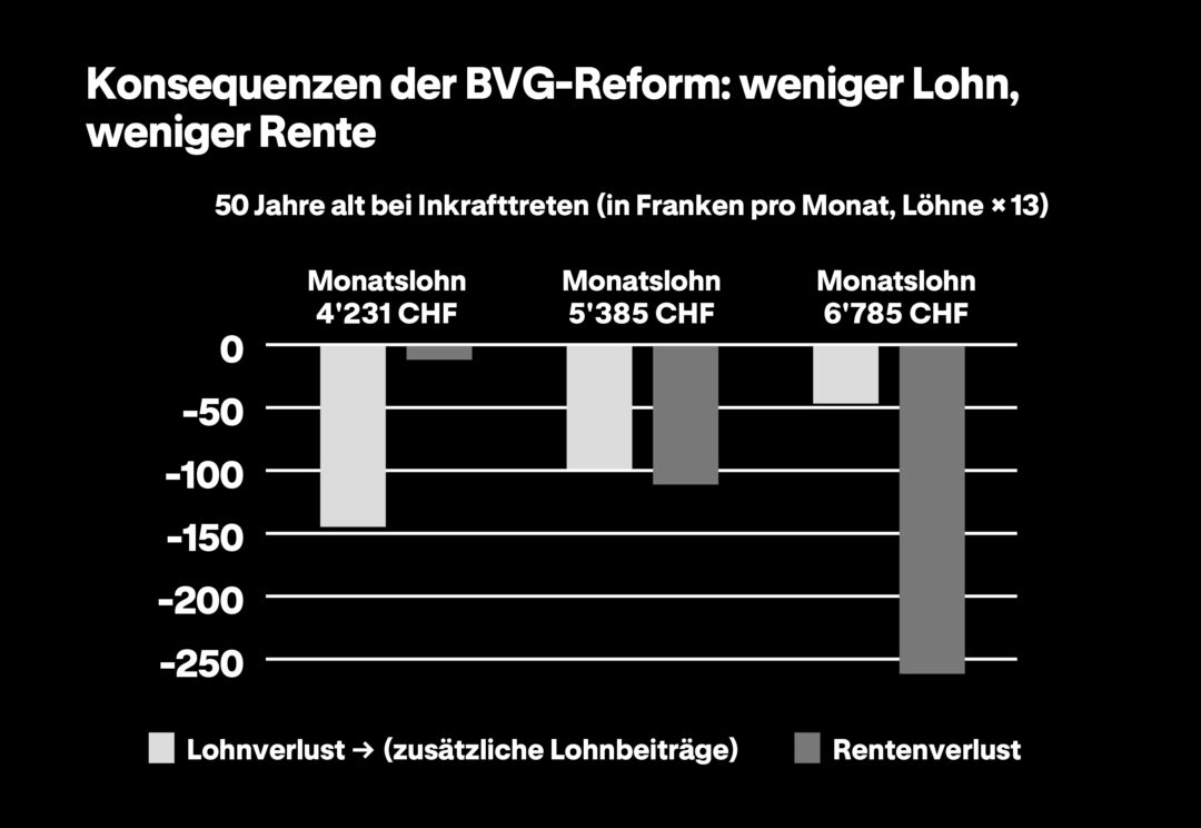 – und dafür weniger Rente bekommen. Mit diesem Beschiss sinken die BVG-Renten um bis zu 3’200 Franken jährlich. Besonders betroffen sind Arbeitnehmende über 50 Jahre und die Mittelschicht. Aber auch ganz Jungen drohen Renteneinbussen. Gleichzeitig steigen mit der Reform die obligatorischen Lohnabzüge – um bis zu 2’400 Franken pro Jahr und Person. Arbeitnehmende mit tiefen Löhnen sind besonders stark betroffen. Obwohl gerade sie besonders stark unter den höheren Lebenshaltungskosten leiden.