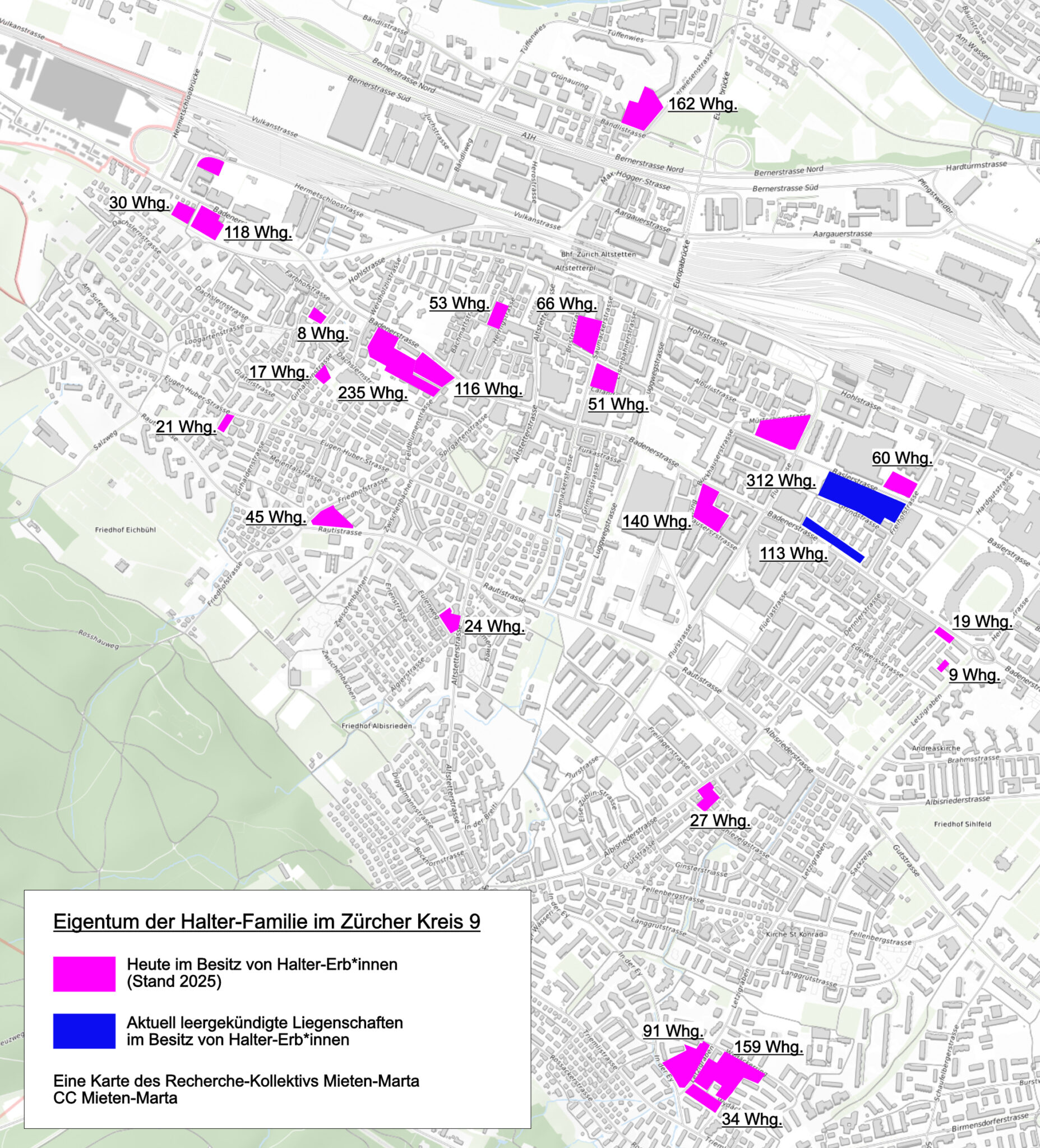 Brisant sind nun die neusten Erkenntnisse des Mieter:innenkollektivs Mieten-Marta von 8. April 2025: Sie zeigen den umfangreichen Grossgrundbesitz der Familie Halter im Zürcher Kreis 9: