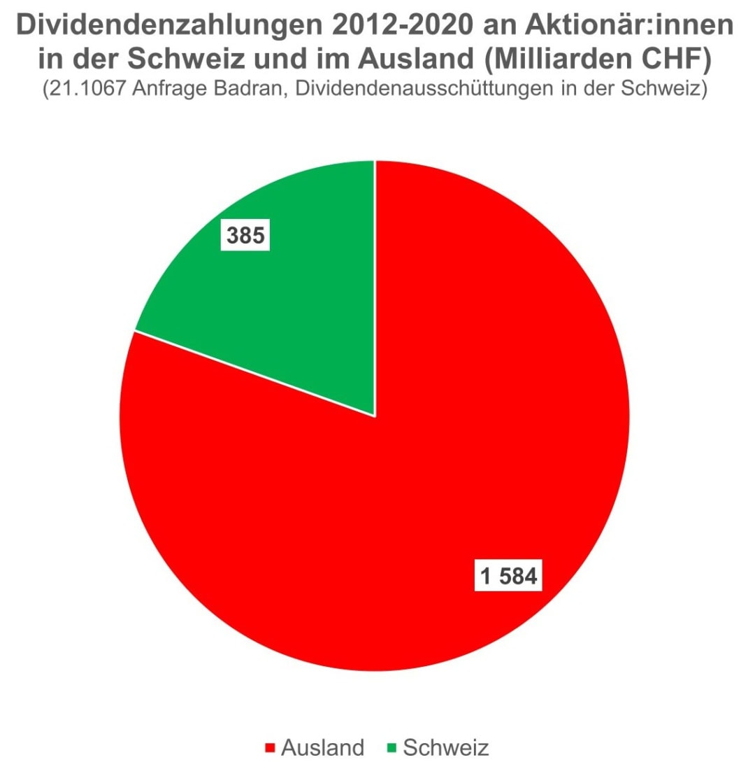 Aufschlussreich und für die Abstimmenden von Interesse ist auch, wer konkret von diesem Dividendensegen profitiert. Laut Antwort des Bundesrats auf eine Anfrage von Jacqueline Badran (21.1067) schütteten Schweizer Firmen von 2012 – 2020 insgesamt 1’970 Milliarden Franken Dividenden aus. Davon gingen 1’584 Milliarden oder 80 Prozent an Aktionär:innen im Ausland. Im Schnitt sind das 176 Milliarden Franken pro Jahr. Eine Grössenordnung zum Vergleich: Das Bruttoinlandprodukt betrug in diesem Zeitraum im Schnitt 680 Milliarden Franken pro Jahr. Der Löwenanteil der Ausland-Dividenden entfällt mit 153 Milliarden CHF auf Ausschüttungen im sogenannten Meldeverfahren, die von CH-Töchtern direkt an ihre ausländischen Mutter-Konzerne gingen. Von den Aktien der börsenkotierten Firmen sind mehr als die Hälfte in der Hand ausländischer Anleger: Damit kommen nochmals 23 Milliarden CHF hinzu, die jährlich ins Ausland abfliessen.