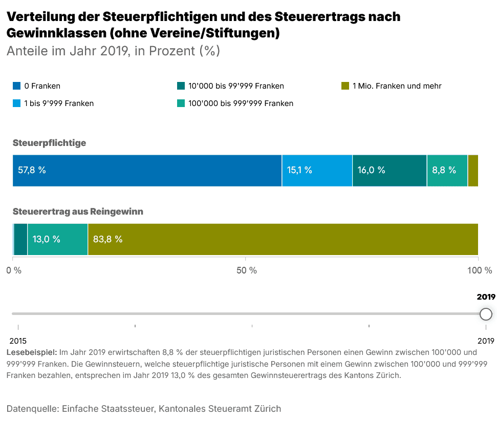 In der Stadt Zürich – wo rund drei Fünftel aller Gewinnsteuern anfallen – ist die Situation noch akzentuierter. Hier versteuern 76 Prozent der Firmen weniger als 10’000 Franken Gewinn. Dagegen liefern gerade mal 261 Firmen mit Gewinnen von 10 Mio Franken und mehr – das sind 0.7% aller juristischen Personen – 83 Prozent der Gewinnsteuern ab (Zahlen für 2023). Finanzvorstand Daniel Leupi bringt plakativ auf den Punkt, wer wie viel von der Gewinnsteuersenkung auf 6% profitiert: