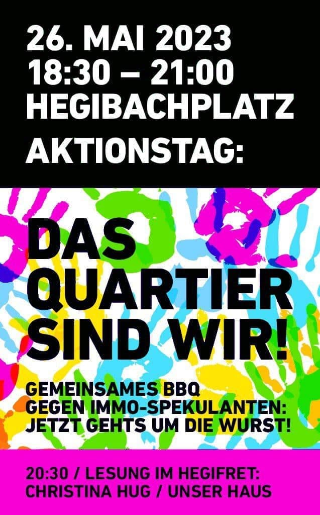 Am Freitagabend am Hegibachplatz geht es um die Wurst: Können die Mieterinnen und Mieter der Forchstrasse 114 – 120 in ihren Wohnungen bleiben oer übernehmen die Speckis? Es gibt Fahnen « Wir bleiben – wir sind das Quartier » zum Kaufen. Kommt spontan und bringt Leute mit!