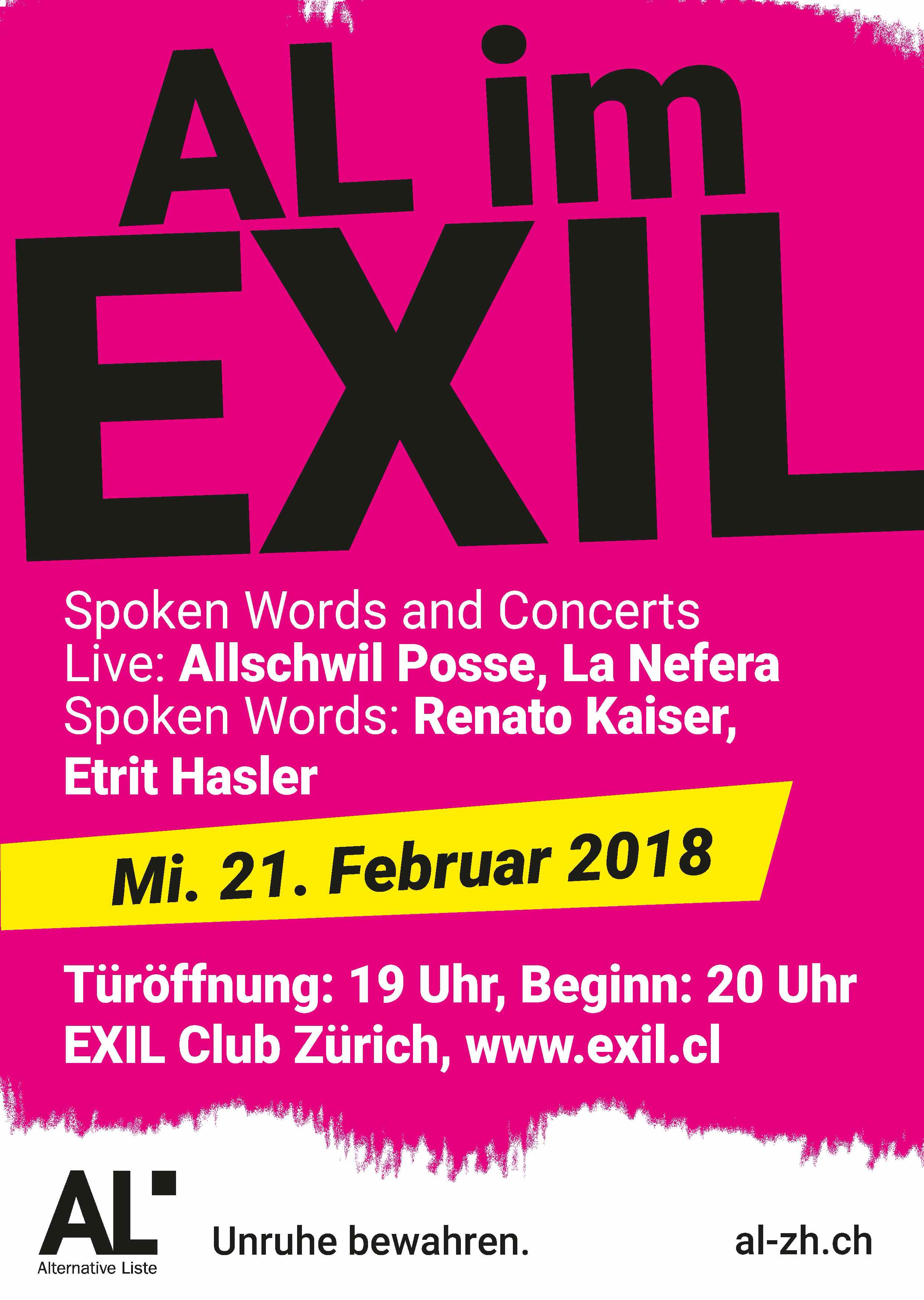 Mittwoch, 21. Februar 2018 ab 19 Uhr. Exil Zürich (www.exil.ch).