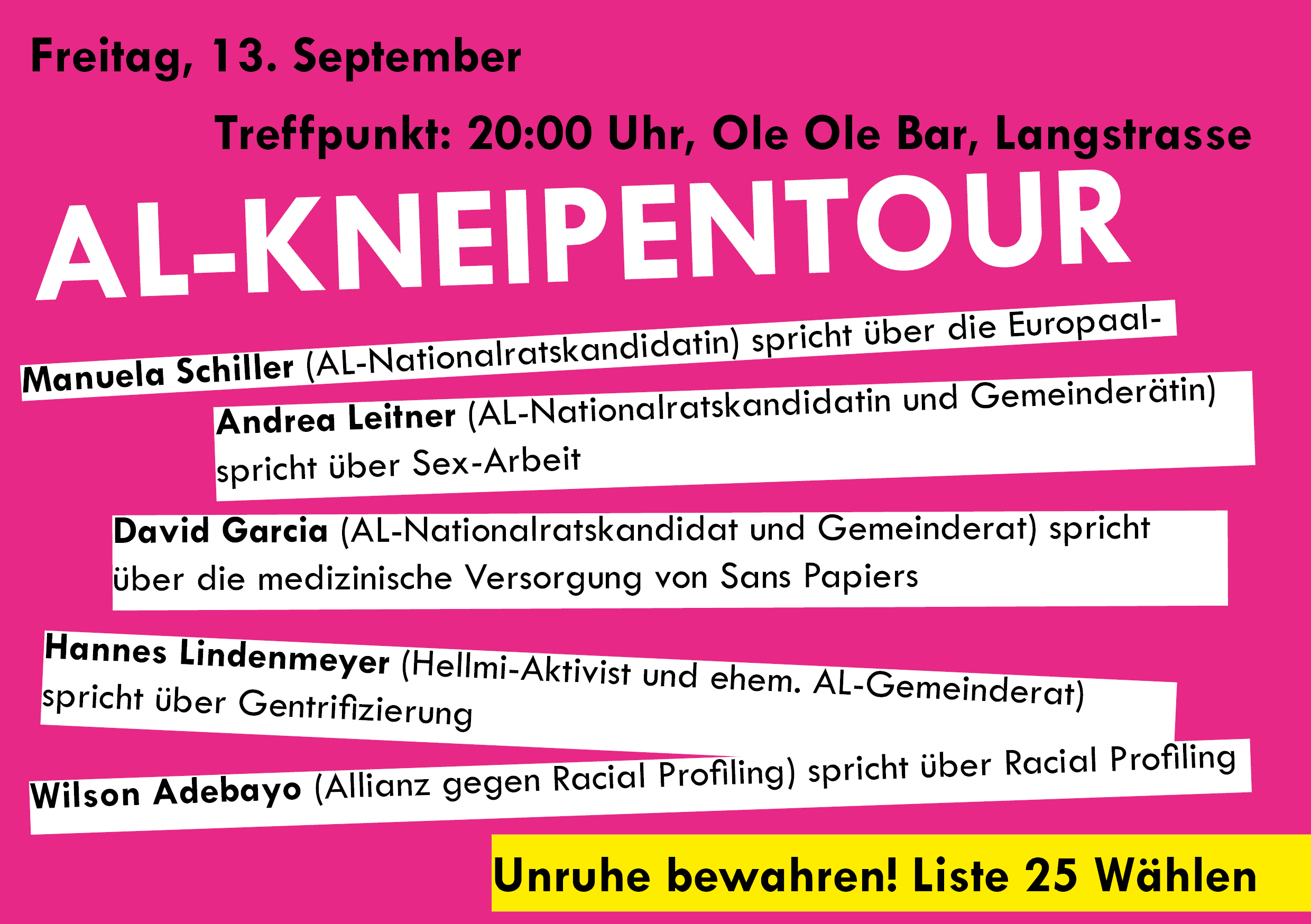 Schon bald stehen die Nationalratswahlen an! Du willst die AL kennenlernen, hast aber keine Lust auf öde Vollversammlungen? Dann komm mit uns auf Kneipentour! Wir ziehen gemeinsam die Langstrasse rauf und AL-Kandidat*innen sowie weitere Personen geben an 5 resp. 6 Stationen kurze politische Inputs, während wir uns jeweils einen Drink genehmigen: