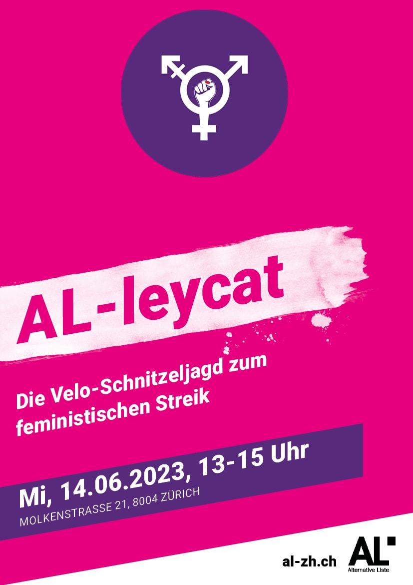 Alleycats sind Postenläufe oder Schnitzeljagden auf dem Velo. Das AL-leycat führt dich auf deinem Velo zu Schauplätzen der feministischen AL-Politik in Zürich. Wie du die verschiedenen Posten bzw. „Checkpoints“ erreichst, verrät dir das „Manifest“. Um Punkte zu sammeln, fährst du die verschiedenen „Checkpoints“ an und löst dort knifflige Aufgaben.