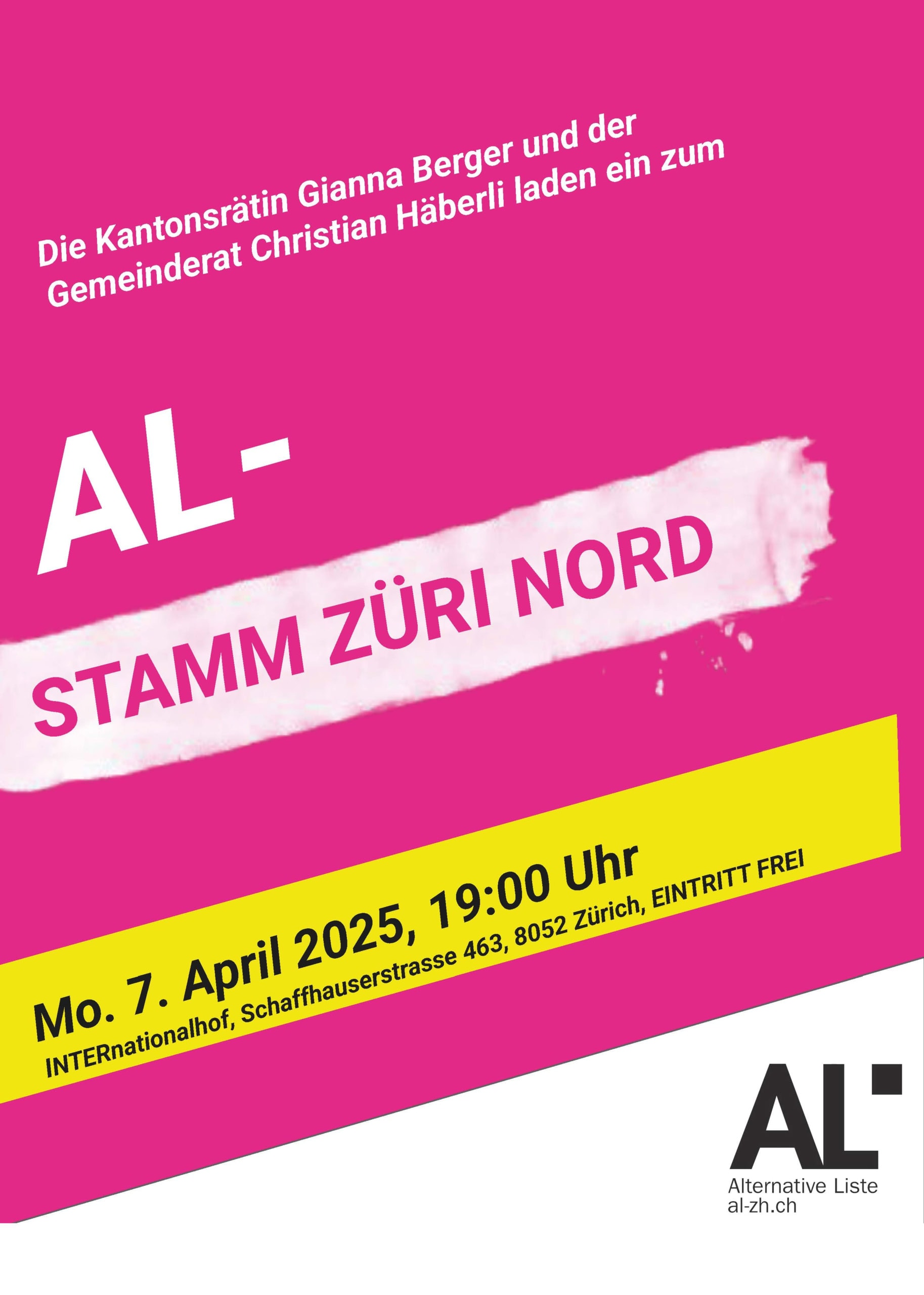 Im AL-Stamm Züri Nord informieren und diskutieren wir aktuelle politische Themen. Wir starten am Montag 7. April mit dem Thema Steuern, ein Kernthema der AL. Im Fokus steht die Steuersenkung, die am 18. Mai zur Abstimmung kommt. Zudem berichten Kantonsrätin Gianna Berger und Gemeinderat Christian Häberli über ihre Parlamentstätigkeit.