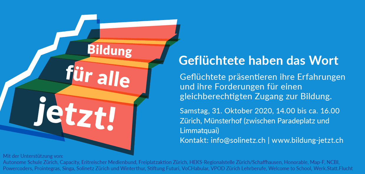 Mit der Unterstützung von: Autonome Schule Zürich, Capacity, Eritreischer Medienbund, Freiplatzaktion Zürich, HEKS-Regionalstelle Zürich/Schaffhausen, Honorable, Map-F, NCBI, Powercoders, Prointegras, Singa, Solinetz Zürich und Winterthur, Stiftung Futuri, VoCHabular, VPOD Zürich Lehrberufe, Welcome to School, Werk.Statt.Flucht