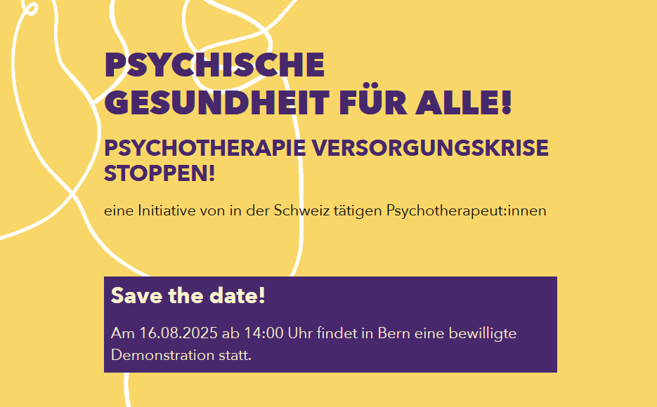 An der bewilligten Kundgebung in Bern tragen wir unsere Anliegen auf die Strasse. Wir fordern Politik, Krankenkassen und Fachpersonal auf, gemeinsam Verantwortung zu übernehmen: für eine funktionierende psychotherapeutische Versorgung, für mehr Chancengleichheit – und für die psychische Gesundheit aller Menschen in der Schweiz.