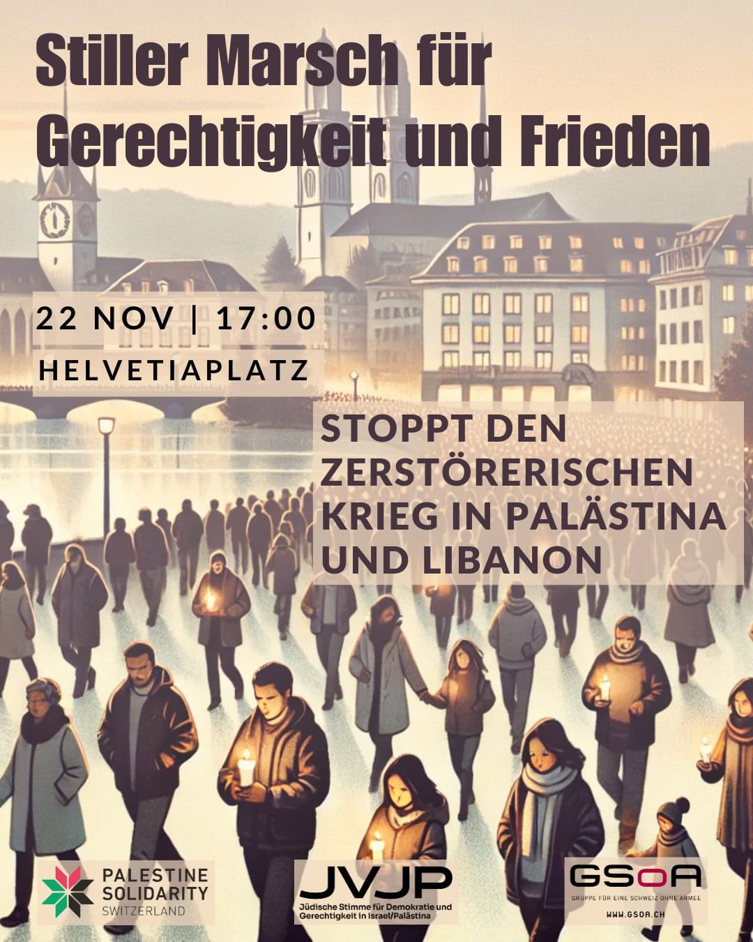 Dieser findet am kommenden Freitag, 22. November, ab 17 Uhr auf dem Helvetiaplatz in Zürich statt. Wir wollen Seite an Seite Solidarität zeigen und uns für humanitäre Werte, friedliche Lösungen und Gerechtigkeit einsetzen.