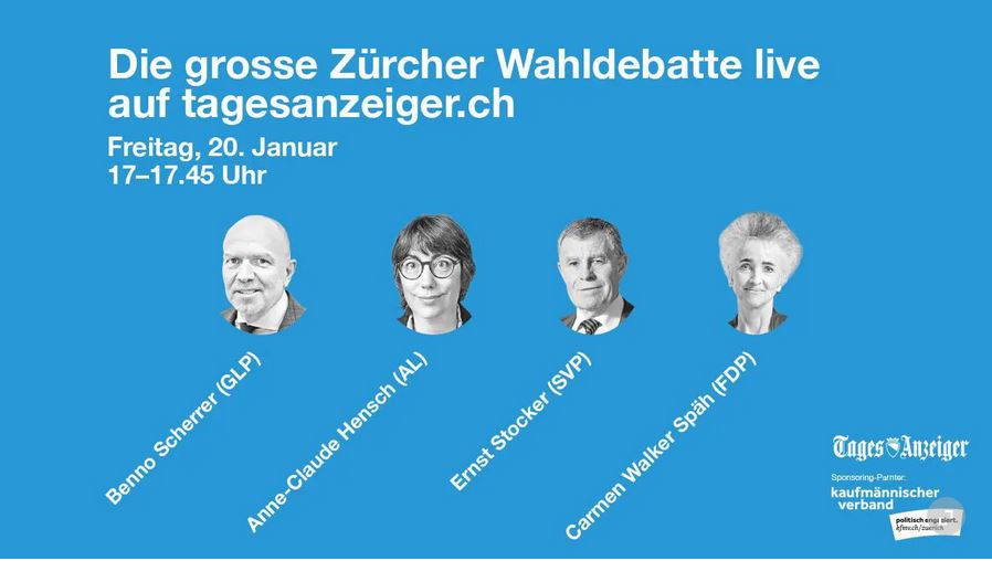 Tages-Anzeiger Live-Wahldebatte zur Regierungsratswahl mit Anne-Claude Hensch, Ernst Stocker, Carmen Walker Späh und Bruno Scherrer