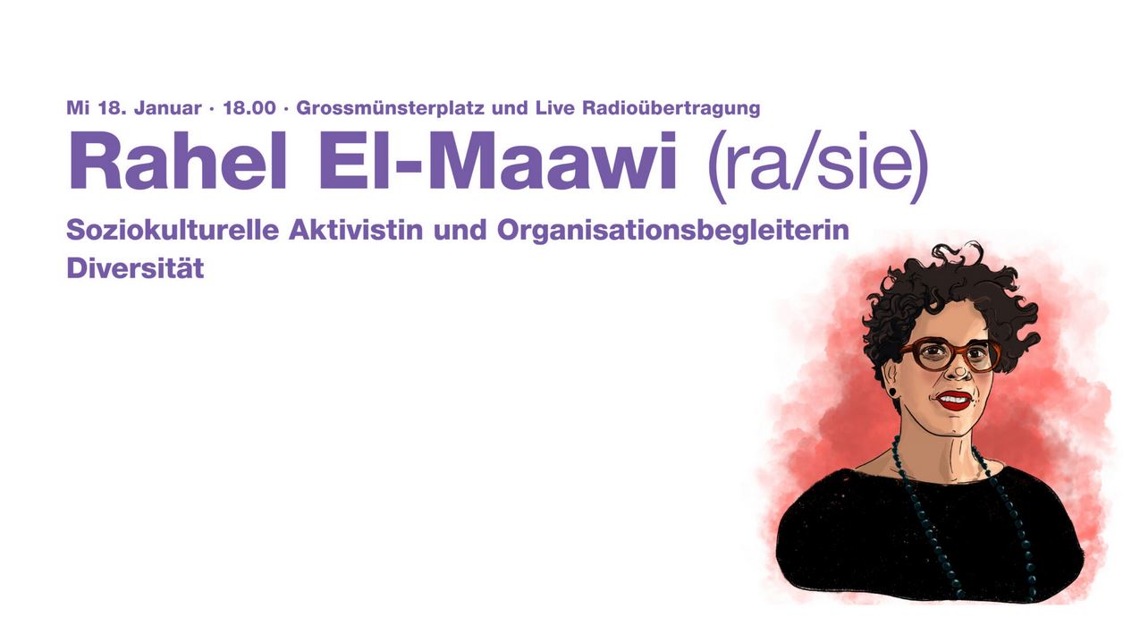 Vom 16.–27. Januar 2023 finden die traditionellen Winterreden auf dem Grossmünsterplatz statt. Nach dem Verstummen des Glockenschlags um 18 Uhr hält am Mittwoch, 18. Januar Rahel El-Maawi, Soziokulturelle Aktivistin und Organisationsbegleiterin Diversität eine Winterrede aus dem Erkerfenster.